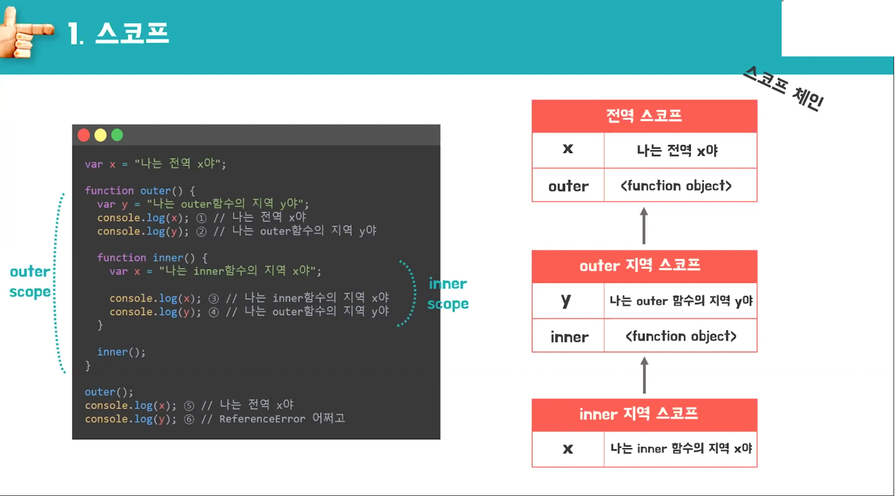 자바스크립트는 정적 스코프, 즉 렉시컬 스코프이기 때문에 함수는 태어나자마자 상위 스코프가 결정이되기 때문에, 함수는 언제나 상위 스코프를 알 수 있게 됩니다. 자바스크립트에서 함수는 상위 스코프를 저장합니다.