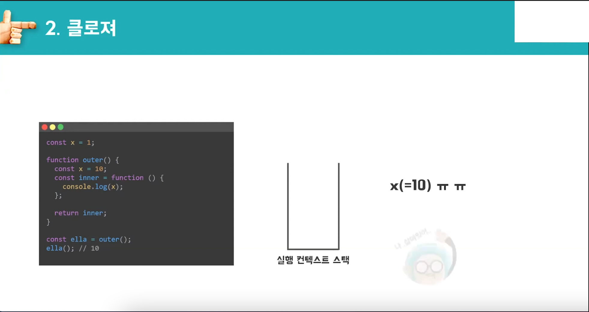 더해서 중첩 함수의 외부 함수보다 더 오래 살아있다면 유지가 된다면 이 중첩 함수는 클로저입니다. 이러한 클로저는 본인의 상의 스코프에서 현재 참조하는 식별자만을 기억을 합니다.