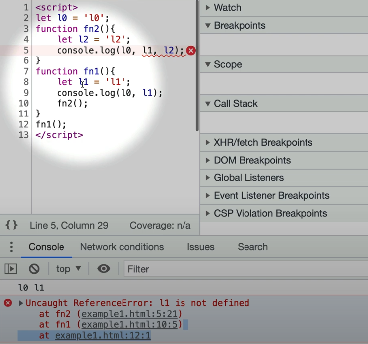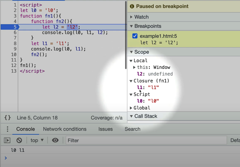 함수를 함수 안에 적용하면 그 함수의 부모 함수의 스코프에 접근할 수 있습니다. 보시다시피 첫 번째 이미지에서는 fn2 함수가 fn1 함수 밖에 선언되어 l2 값을 콘솔로 찍을 때 값이 undefined로 나오지만, 두 번째 이미지에서 fn2 함수가 fn1 함수 내부에서 선언되자 에러 없이 값이 잘 찍히는 것을 볼 수 있습니다. 이때 이 내부 함수, fn2 함수를 클로저라고 부릅니다.