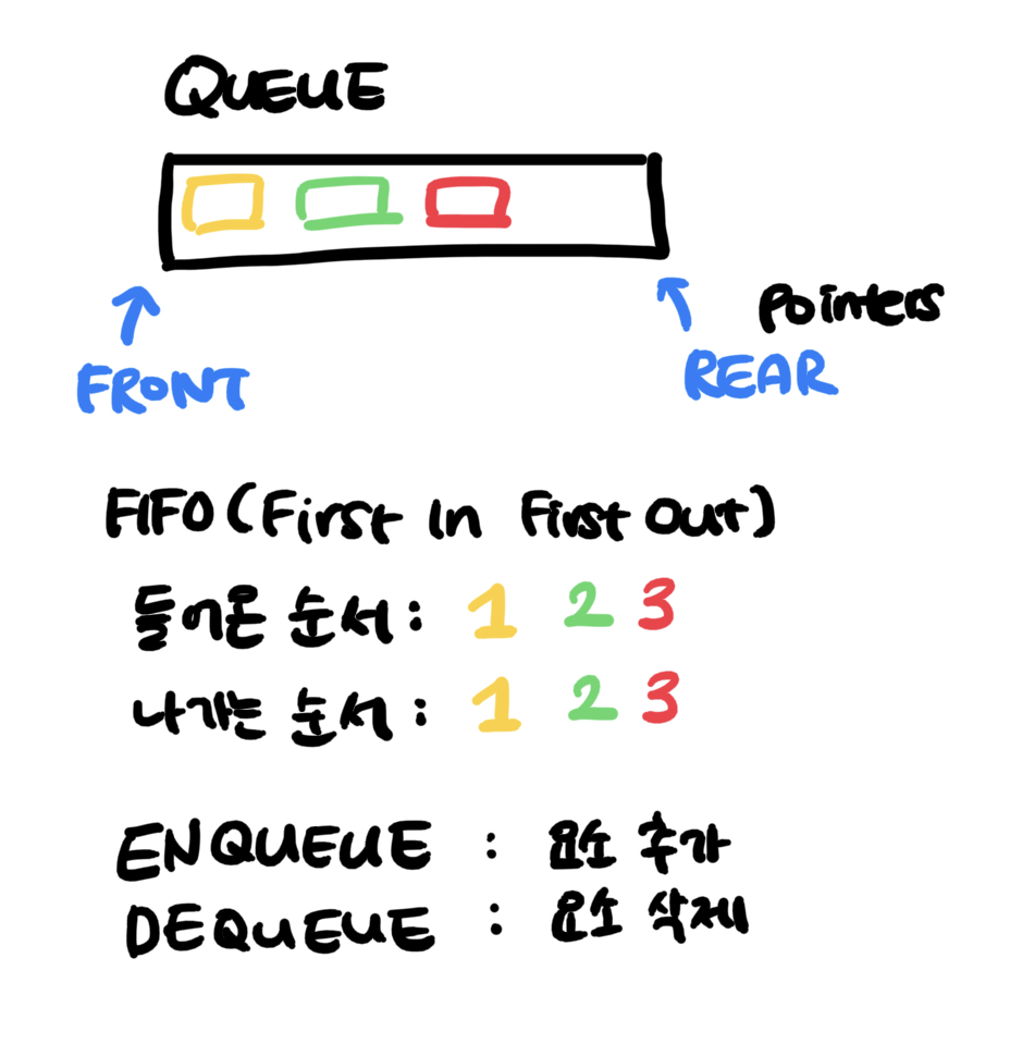 큐란 rear로 객체를 삽입하고 front로 객체를 삭제하는 선형 데이터 구조입니다. 큐는 FIFO(First In First Out) 방식을 사용하고 있어, 가장 먼저 들어온 객체가 가장 먼저 처리되어 삭제됩니다. 이때 객체의 삽입을 Enqueue, 삭제를 Dequeue라고 합니다. 그리고 큐에는 첫 번째 객체와 마지막 객체를 가리키는 front와 rear 포인터가 항상 존재합니다.